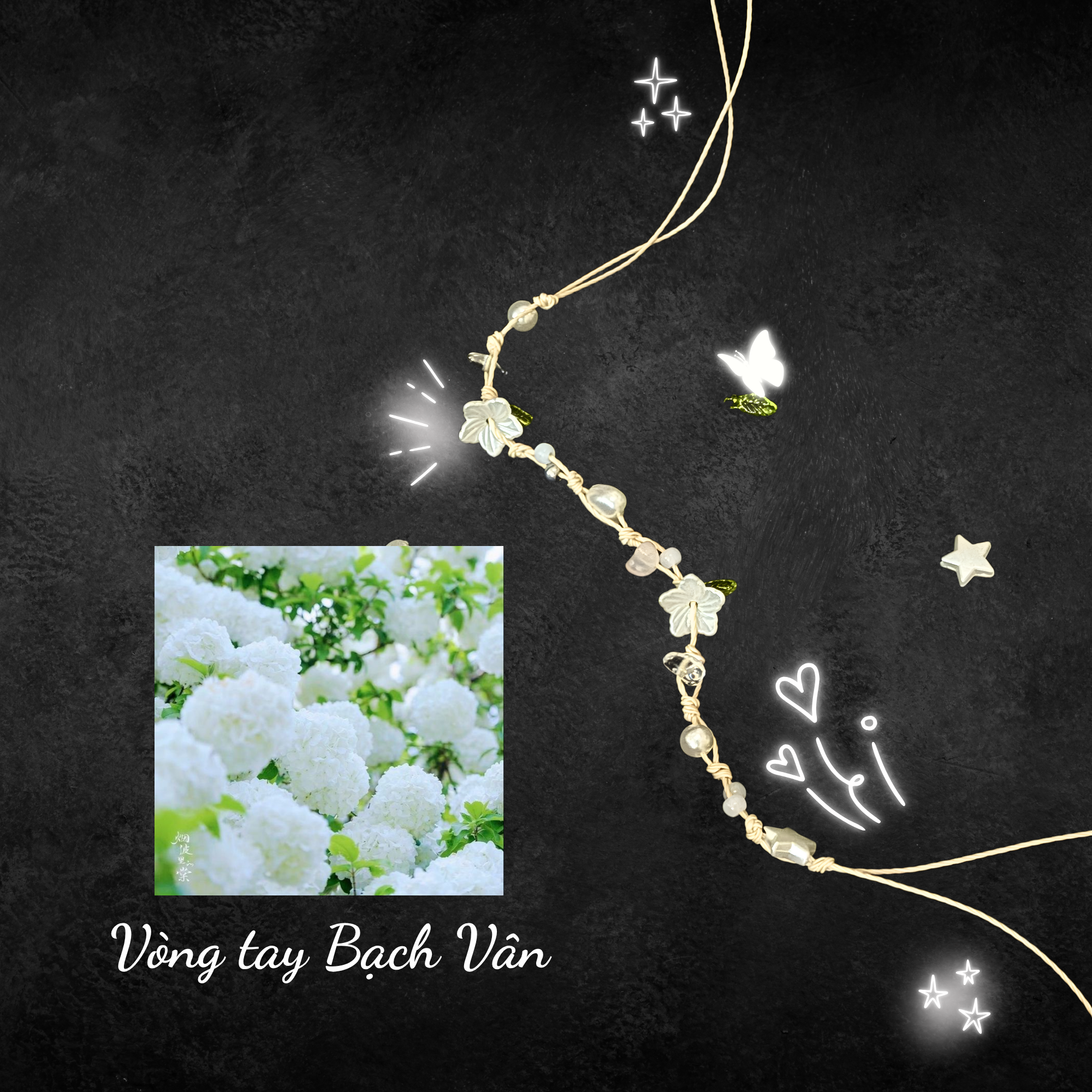 Vòng Tay Bạch Vân được lấy cảm hứng từ những cụm mây trắng bồng bềnh giữa bầu trời trong xanh. Chiếc vòng mang đến cảm giác tinh khôi, nhẹ nhàng và thuần khiết, như hơi thở của buổi sớm mai. Từng đường đan được thực hiện thủ công tỉ mỉ, lưu giữ nét tự nhiên và thanh thoát trong từng chi tiết nhỏ.